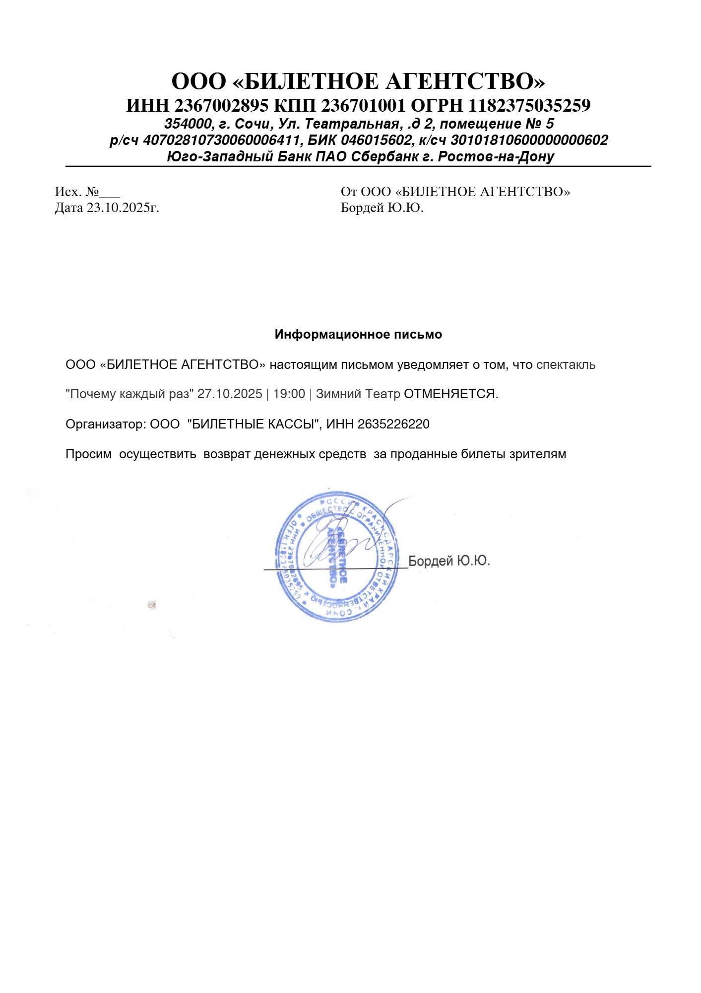 Уважаемый клиент! Спешим сообщить, что по информации, полученной от организатора, спектакль «Почему каждый раз», запланированный на 27 октября 2025 года в 19:00 в Зимнем театре Сочи, отменен. Деньги за электронные билеты вернутся автоматически в полном объёме на карту, с которой была произведена оплата. Если вы купили билет в кассе Ticketland.ru за наличный расчет, то обратитесь, пожалуйста, на почту: vozvrat@ticketland.ru. С уважением, команда поддержки Ticketland.
