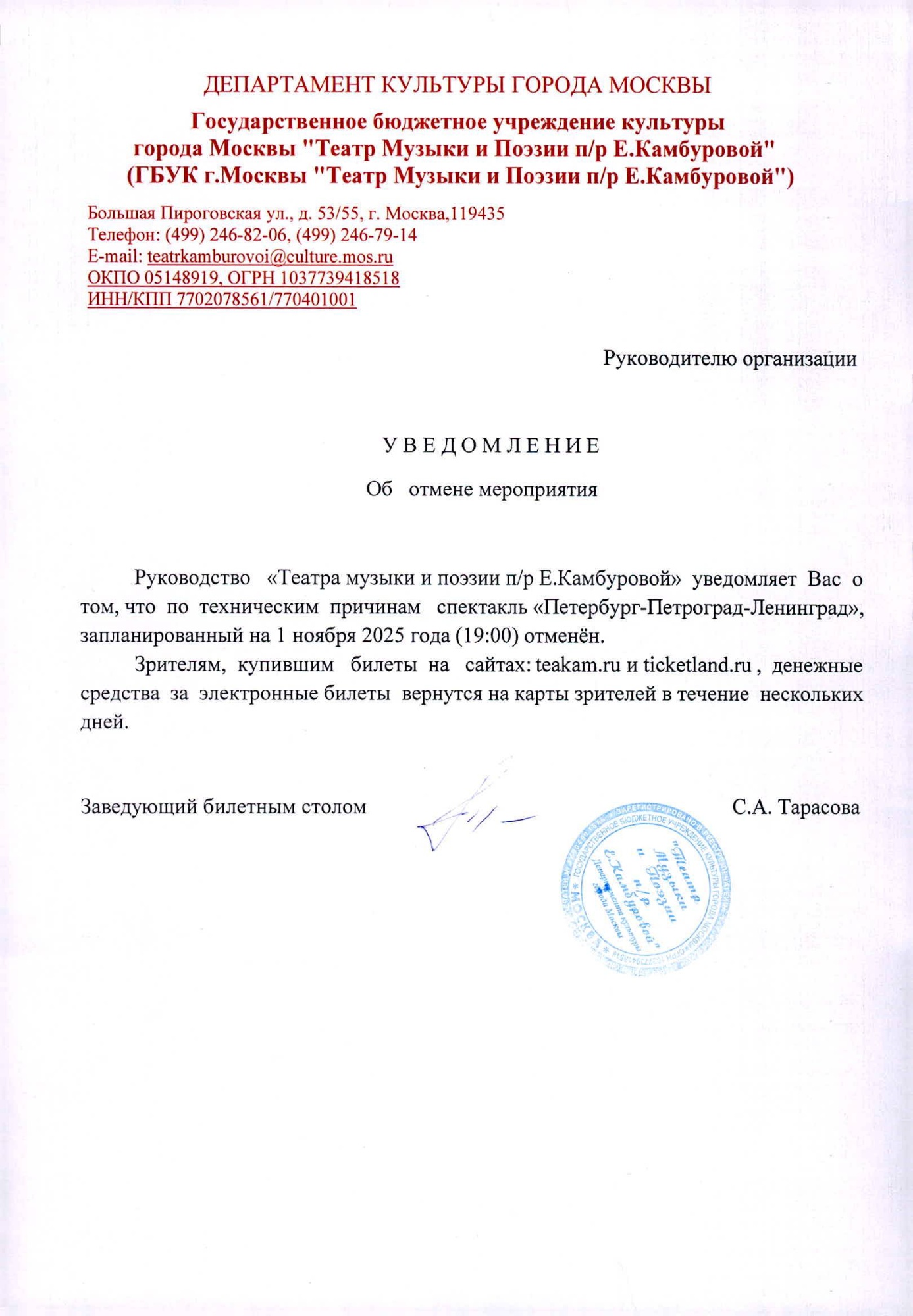 Уважаемый клиент! Спешим сообщить, что по информации, полученной от организатора, спектакль «Петербург-Петроград-Ленинград», запланированный на 1 ноября 2025 года в 19:00 в театре Камбуровой, отменен. Деньги за электронные билеты вернутся автоматически в полном объёме на карту, с которой была произведена оплата. Если вы купили билет в кассе Ticketland.ru за наличный расчет, то обратитесь, пожалуйста, на почту: vozvrat@ticketland.ru. С уважением, команда поддержки Ticketland.