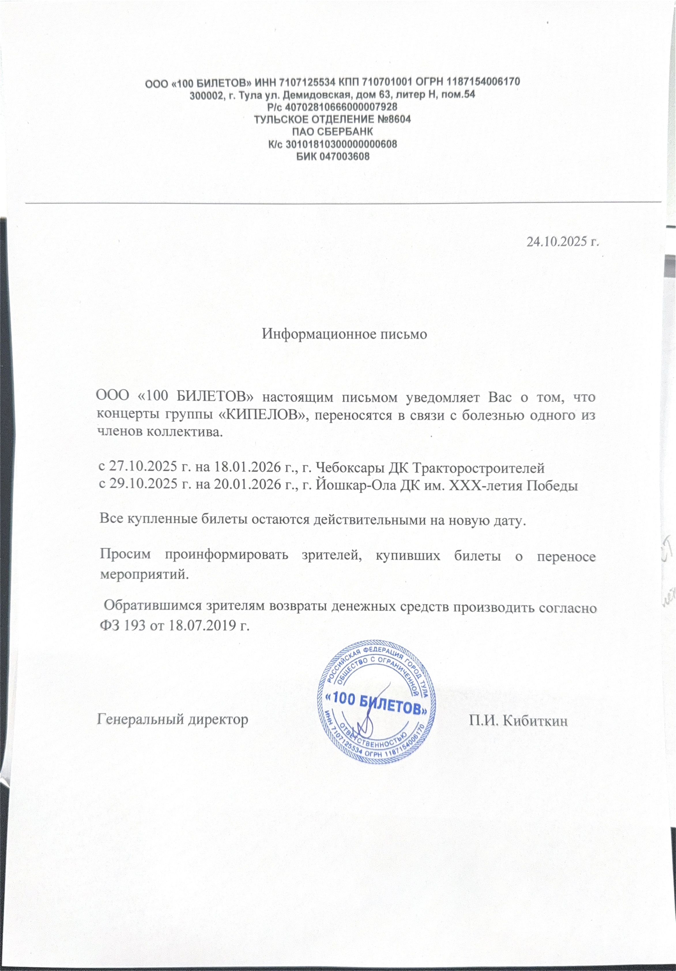 Уважаемый клиент! Спешим сообщить, что по информации, полученной от организатора, концерт группы «Кипелов», запланированный на 27 октября 2025 года в ДК «Тракторостроителей» Чебоксары, перенесён на 18 января 2026 года, начало в 19:00. Ранее приобретенные билеты действительны на новую дату, обменивать их не нужно. Если вам не удобно посетить концерт в новую дату, вы можете вернуть билет по кнопке в личном кабинете во вкладке «Заказы» (до 18.01.26 19:00). Деньги за электронные билеты вернутся автоматически в полном объёме на карту, с которой была произведена оплата. Если вы купили билет в кассе Ticketland.ru за наличный расчет, то обратитесь, пожалуйста, на почту: vozvrat@ticketland.ru. С уважением, команда поддержки Ticketland.